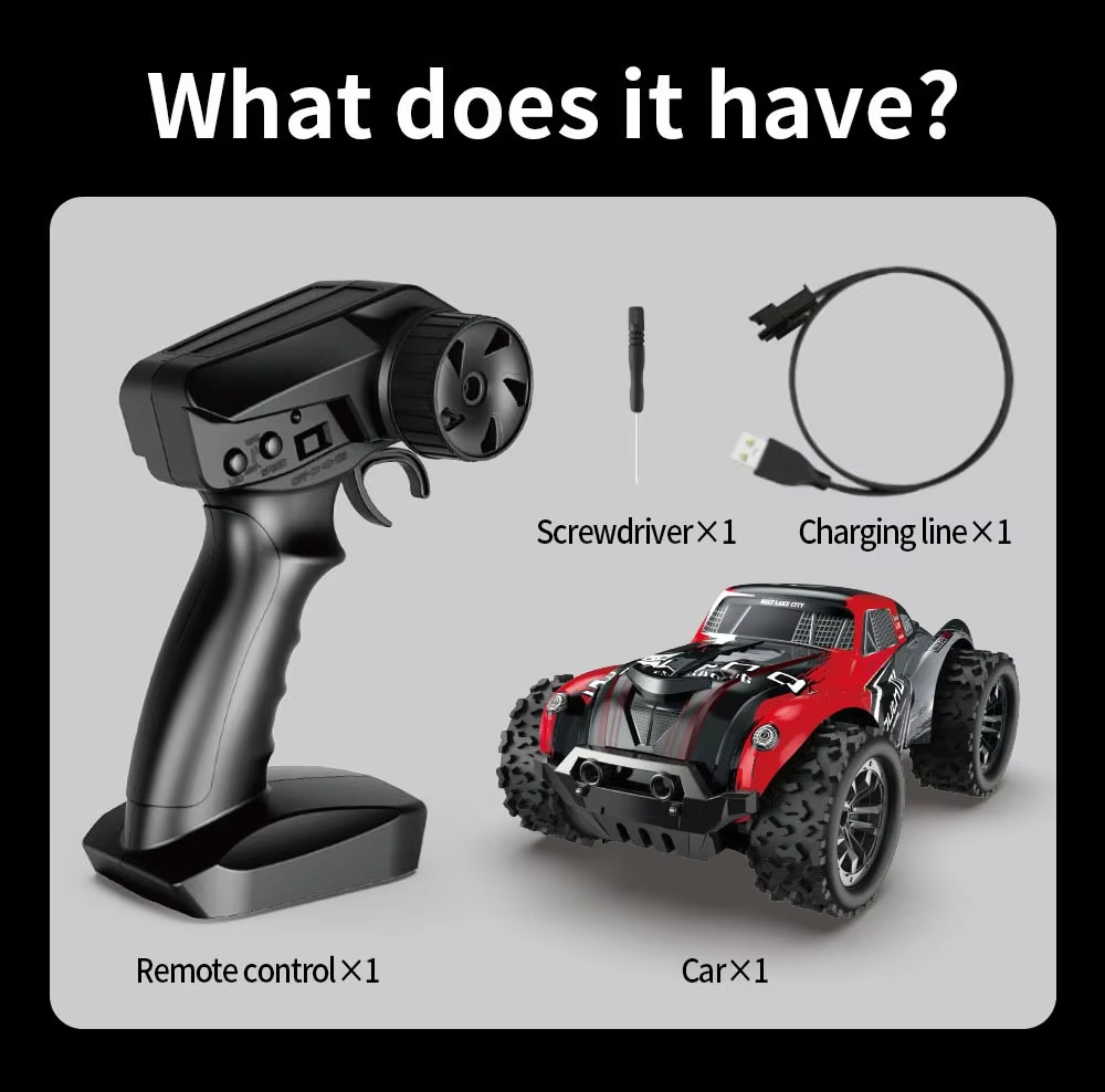 RC Car x 1, Remote Controller x 1, Vehicle Battery x 1, USB Charging Cable x 1, Screwdriver x 1, User Manual x 1